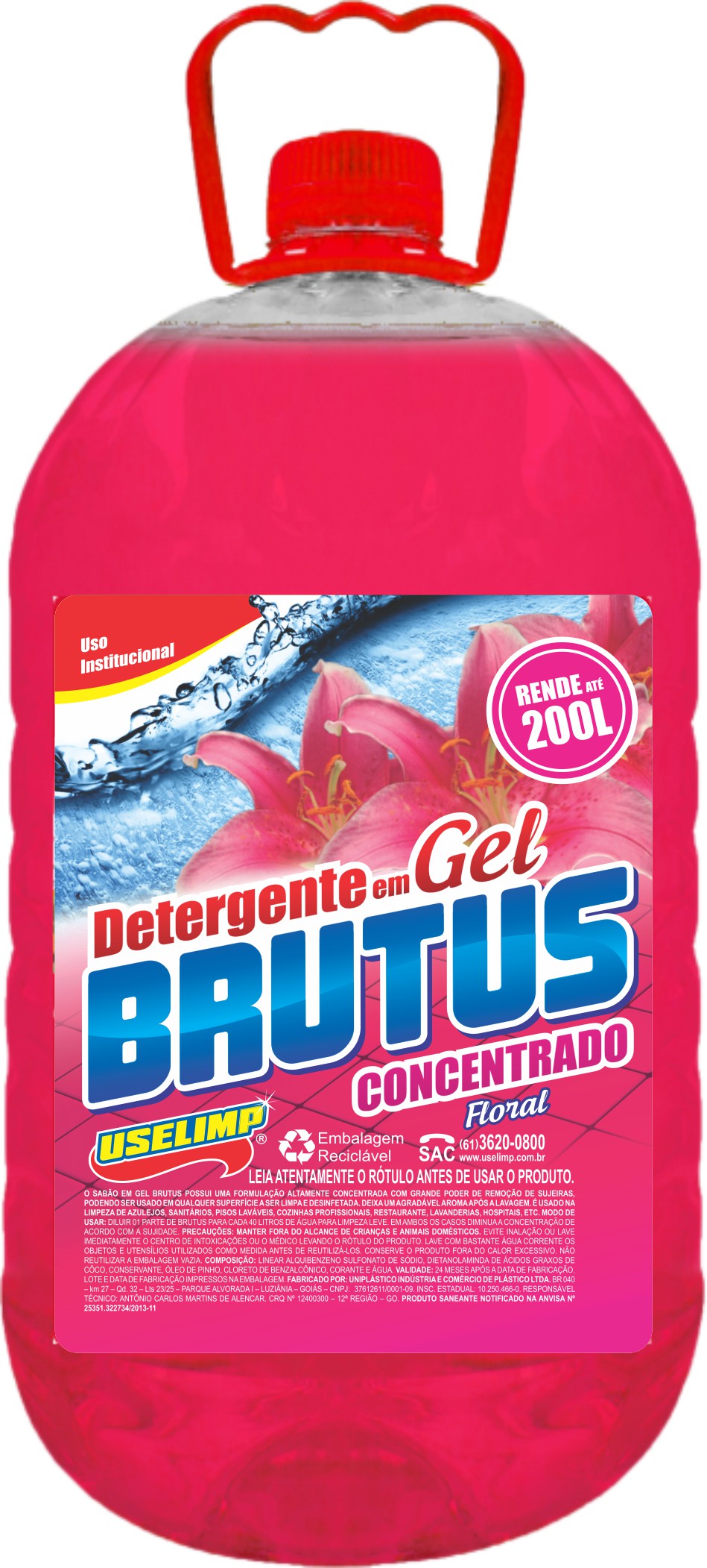 BRUTUS 3 EM 1 (6X2L, 4X5L): Sabão gelatinoso altamente concentrado com grande poder de remoção de sujeiras. Podendo ser usado em qualquer superfície a ser limpa e desinfetada. Deixa um agradável perfume após a lavagem. É usado na limpeza de azulejos, sanitários, pisos laváveis, cozinhas profissionais, restaurantes, lavanderias, hospitais, etc.