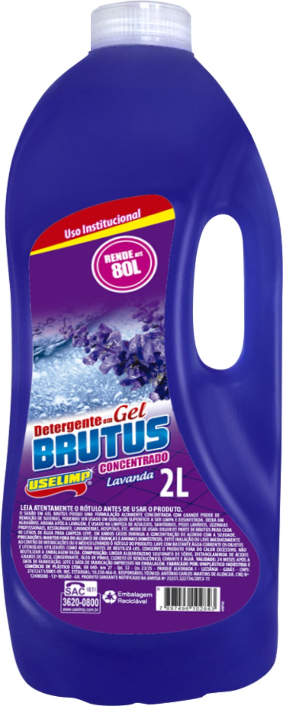 BRUTUS 3 EM 1 (6X2L, 4X5L): Sabão gelatinoso altamente concentrado com grande poder de remoção de sujeiras. Podendo ser usado em qualquer superfície a ser limpa e desinfetada. Deixa um agradável perfume após a lavagem. É usado na limpeza de azulejos, sanitários, pisos laváveis, cozinhas profissionais, restaurantes, lavanderias, hospitais, etc.